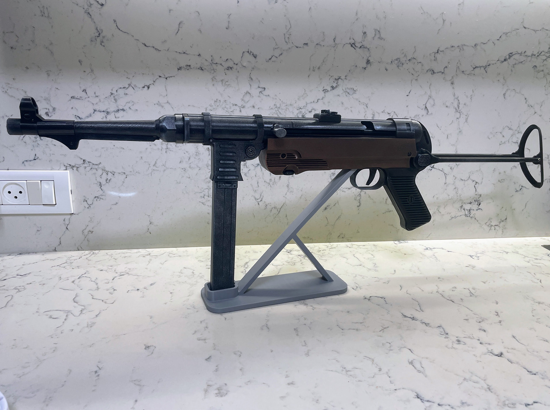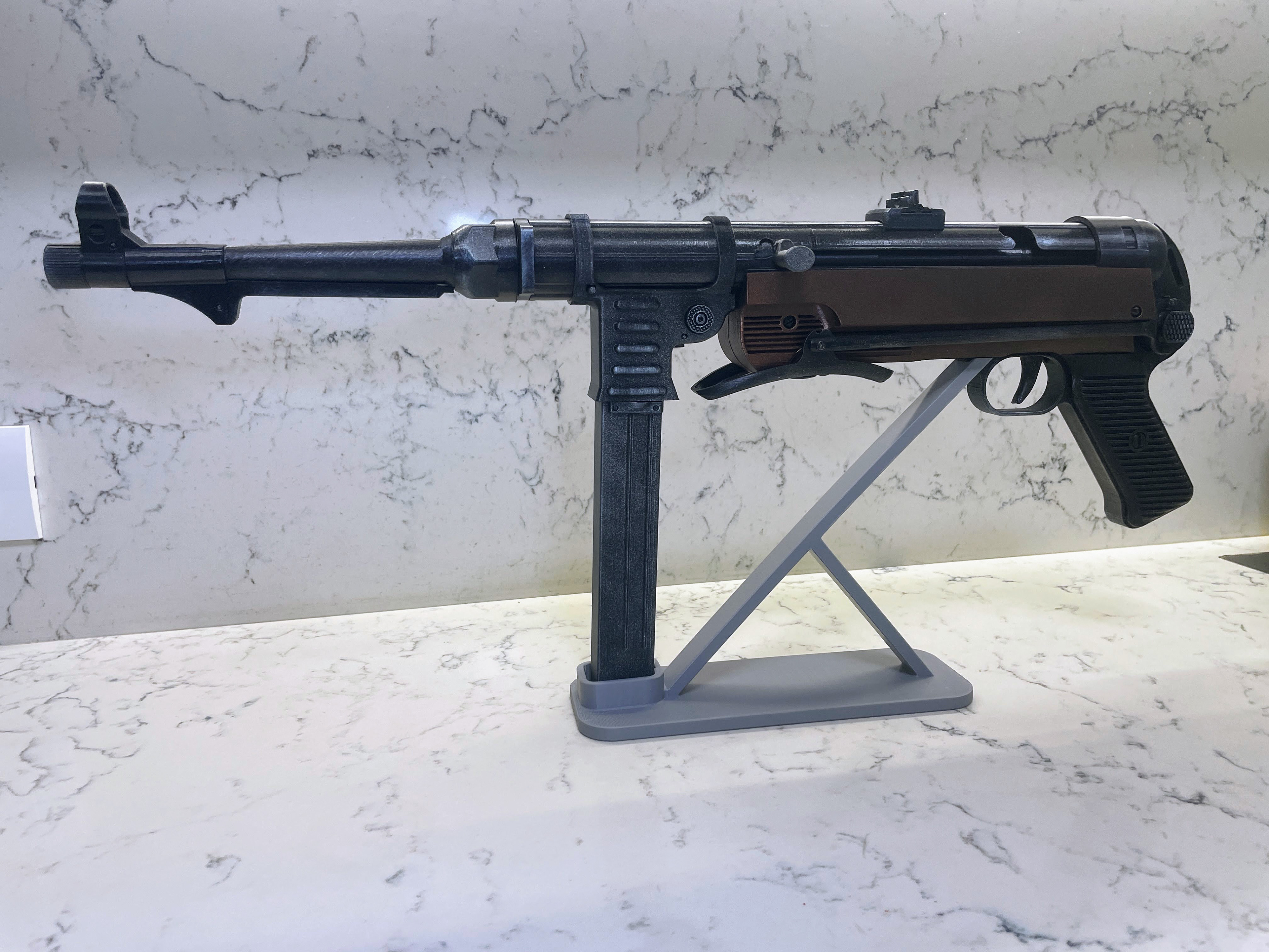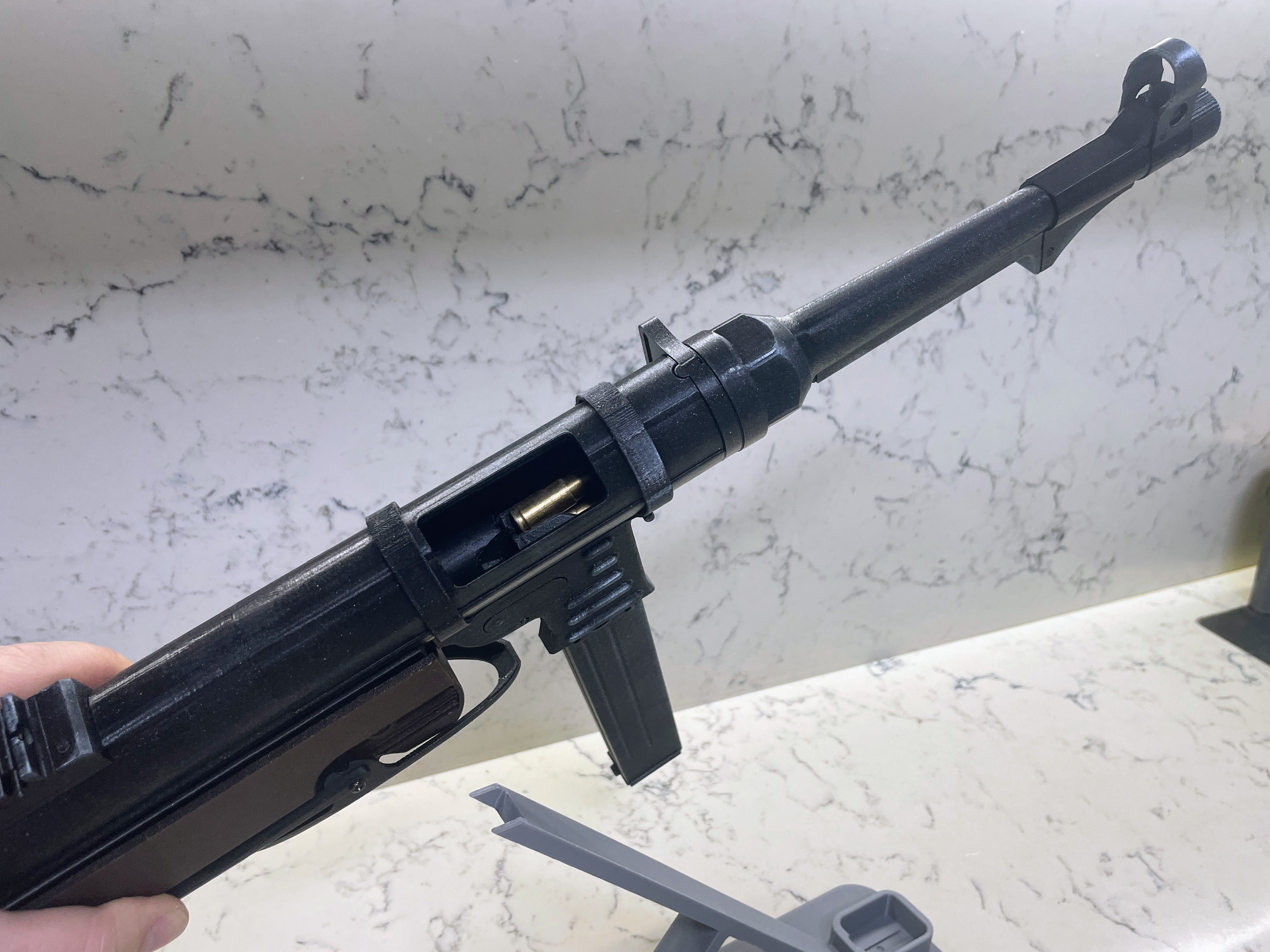 The MP40, or Maschinenpistole 40, is one of the most iconic submachine guns of World War II. Designed in Nazi Germany, this 9mm firearm was valued for its simplicity, reliability, and ease of use, making it a preferred weapon for paratroopers and infantry. Its compact design and foldable stock made it ideal for close-quarters combat. The MP40's sleek, all-metal construction and historical significance have made it a sought-after collector’s item and a symbol of mid-20th-century military innovation. Today, it stands as a powerful reminder of wartime engineering and history.