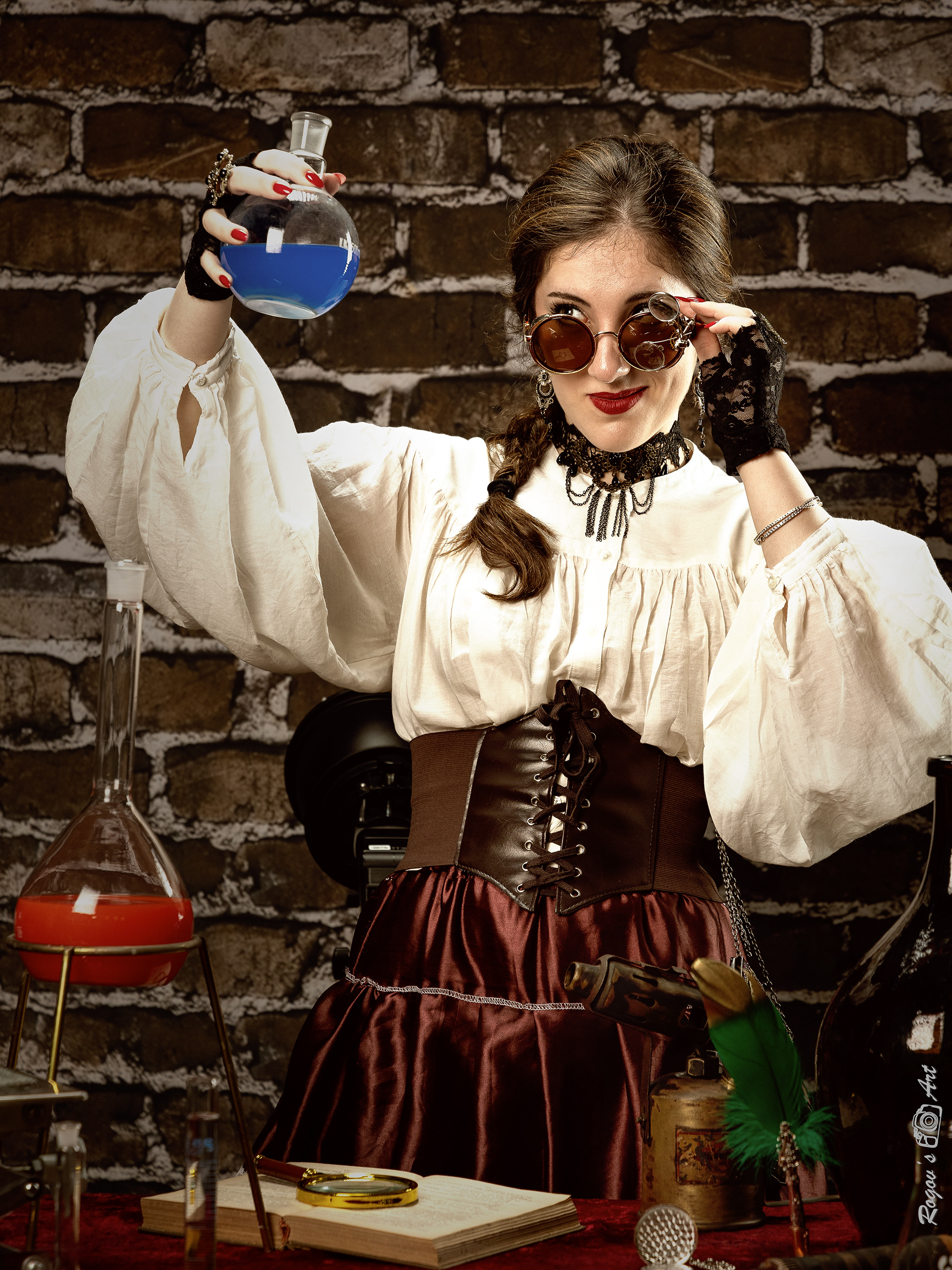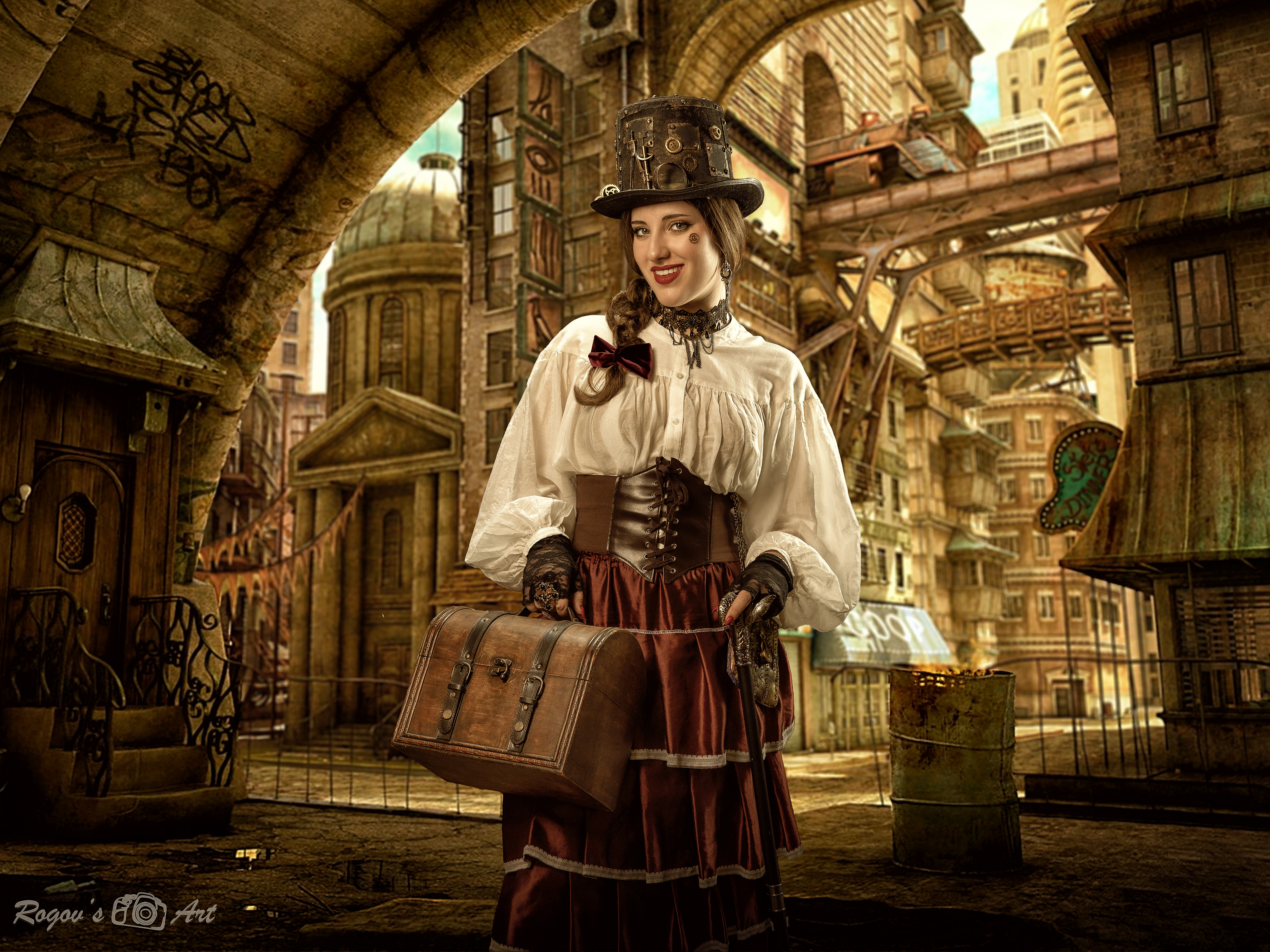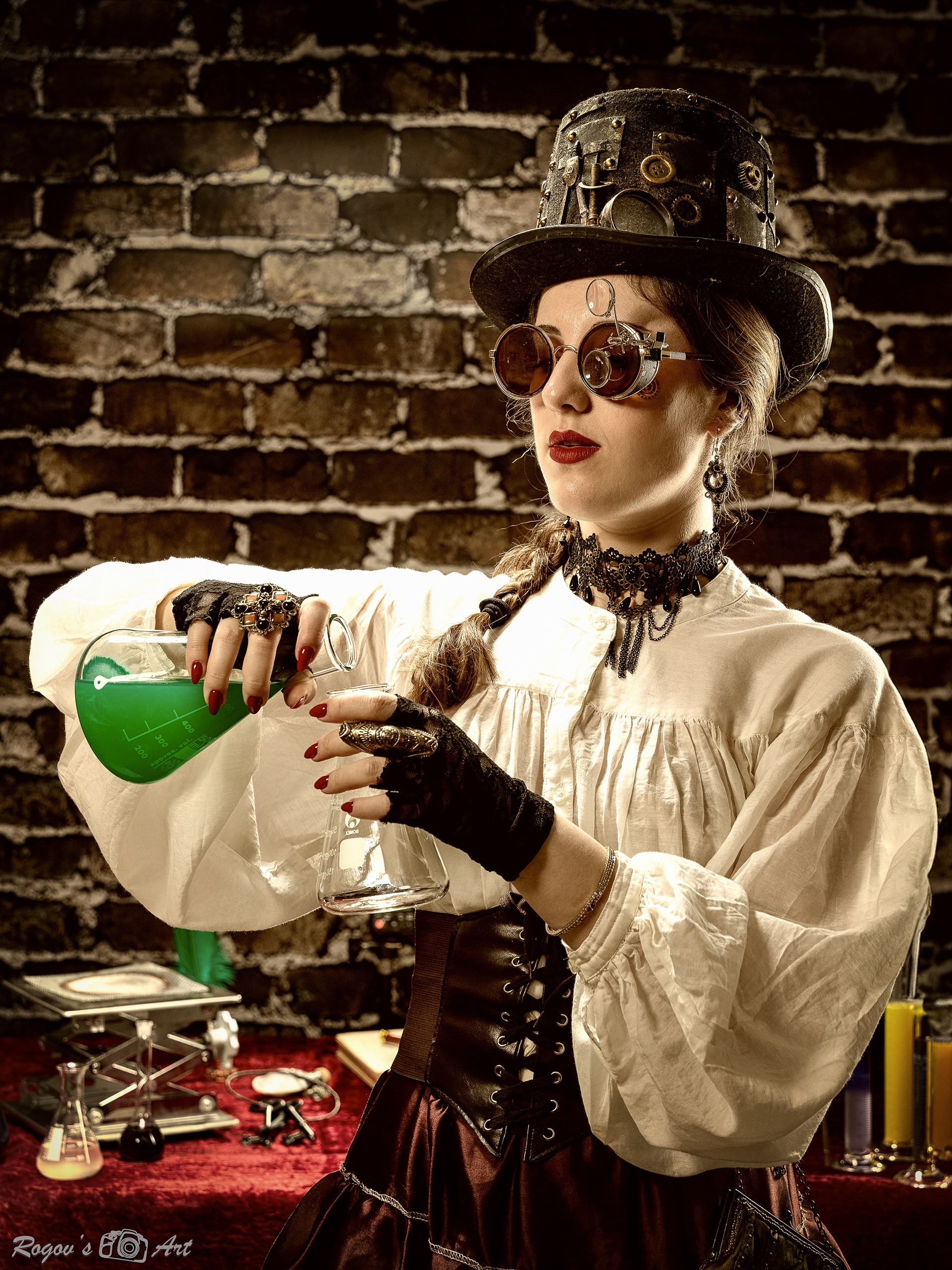 Steampunk is a subgenre of science fiction inspired by the technologies and fantasy of the 19th century, particularly steam-powered machinery. Typically, steampunk envisions an alternate development of humanity, mastering mechanics and steam technology, with a distinct overall stylization reminiscent of the Victorian era in England (the second half of the 19th century). Our journey into genre photography began with our first Steampunk session in January of the 21st year. This time, we collaborated as a team of three: Marina and Emily worked on the costumes and makeup, with Marina even taking some photographs. The costumes were designed by the talented Miller Miri.