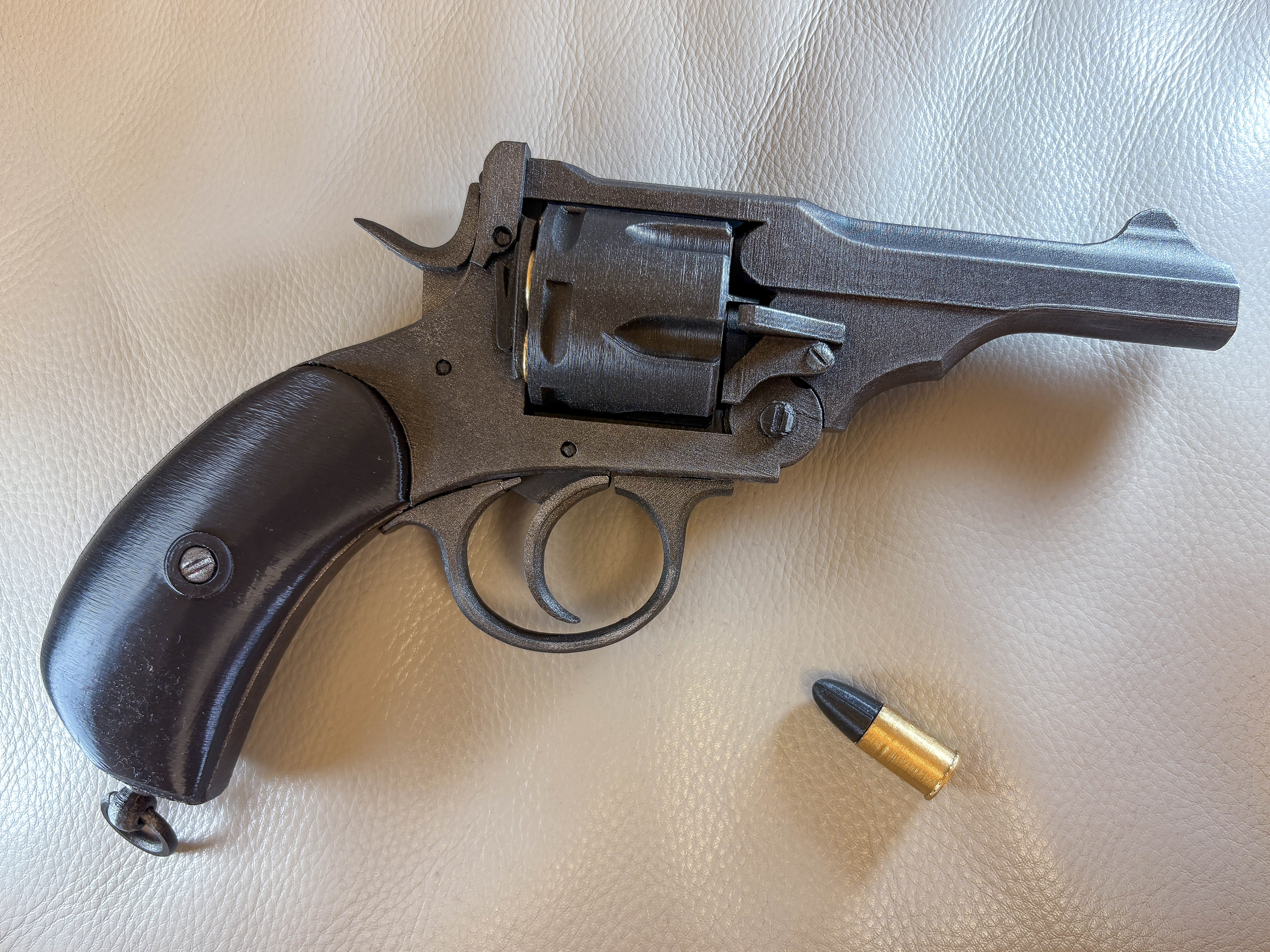 Few sidearms are as instantly recognizable — the top-break frame, the broad extractor hinge, the heavy British lines.